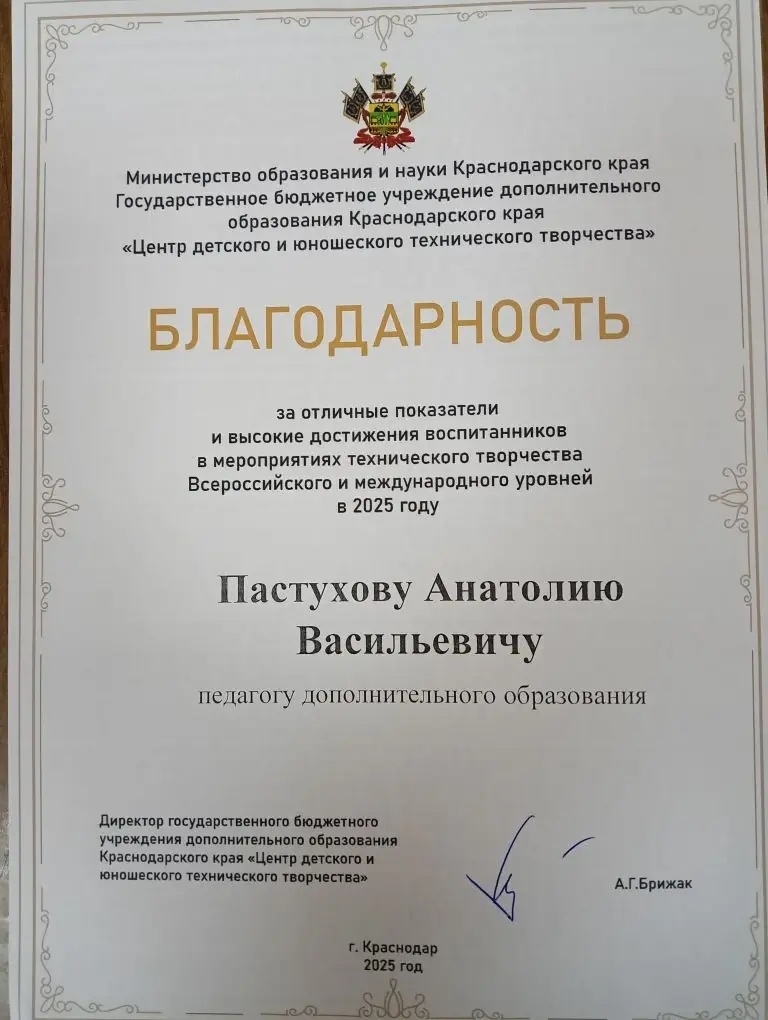 В рамках регионального фестиваля авиамоделирования и беспилотных летательных аппаратов «Авиафест», который состоялся 24 декабря в городе Краснодаре были подведены итоги рейтинга развития технического творчества в Краснодарском крае учреждений дополнительного образования, реализующих программы дополнительного образования технической направленности, педагогов дополнительного образования за достижения в развитии технического творчества.Благодарственное письмо министерства образования и науки Краснодарского края вручена педагогу дополнительного образования МБУДО Центра творчества «Созвездие» Пастухову Анатолию Васильевичу.